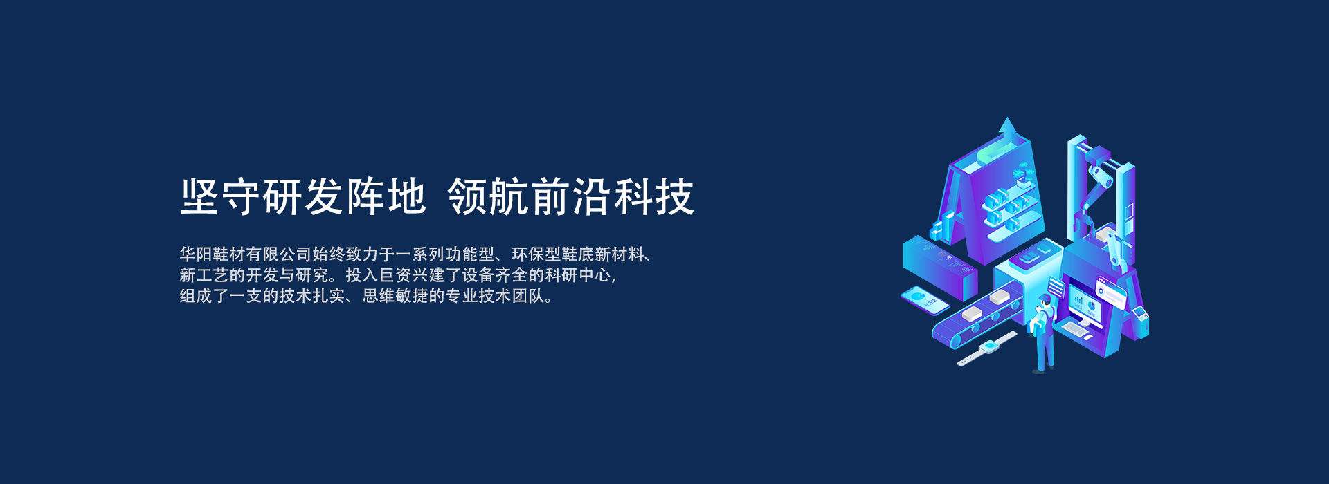 華陽(yáng)鞋材有限公司始終致力于一系列功能型、環(huán)保型鞋底新材料、新工藝的開發(fā)與研究。投入巨資興建了設(shè)備齊全的科研中心,組成了一支的技術(shù)扎實(shí)、思維敏捷的專業(yè)技術(shù)團(tuán)隊(duì)。全球領(lǐng)先的材料科學(xué)分析儀器和檢測(cè)設(shè)備,形成了從材料研發(fā)、新品開發(fā)、實(shí)驗(yàn)測(cè)試、技術(shù)轉(zhuǎn)移到規(guī)模生產(chǎn)的一體化作業(yè)流程,為產(chǎn)品的生產(chǎn)提供了有力的品質(zhì)保障。